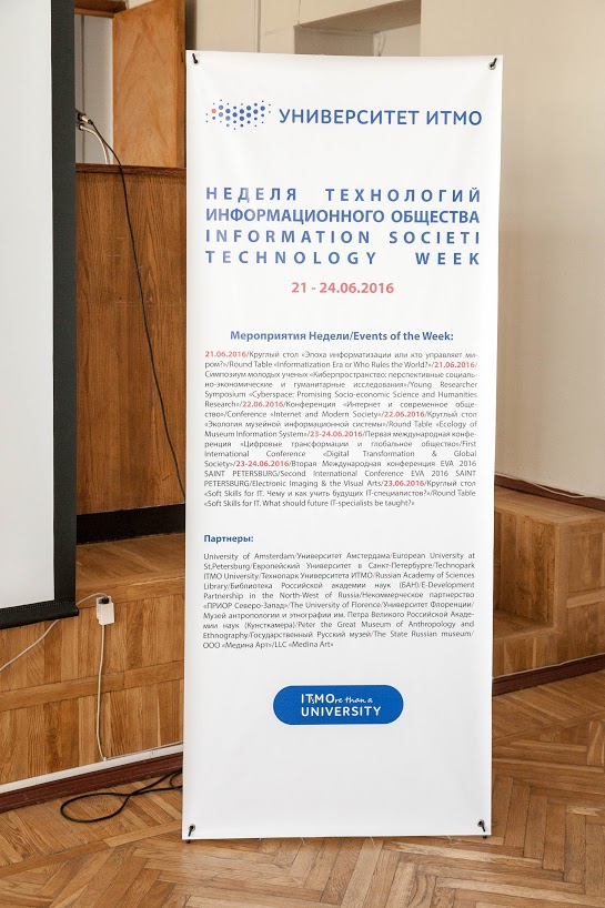 C 23 по 24 июня 2016 года была проведена Международная научная конференция EVA 2016 SAINT PETERSBURG (Electronic Imaging & the Visual Arts). Конференция была организована Университетом ИТМО совместно с Государственным русским музеем и Сentro per la comunicazione e l'integrazione dei media (micc), Università degli Studi di Firenze. Целью конференции стало предоставление дискуссионной площадки специалистам и ученым гуманитарных и технических специальностей для обсуждений, обмена опытом, идеями и планами по широкому спектру вопросов применения информационных технологий в культуре и искусстве. Участники получили актуальную информацию о тенденциях развития информационно-коммуникационных технологий (ИКТ) и их приложения в области сохранения культурного наследия, а также узнали о новых результатах проектов в сфере культуры, искусства, археологии и истории, полученных с использованием ИКТ.