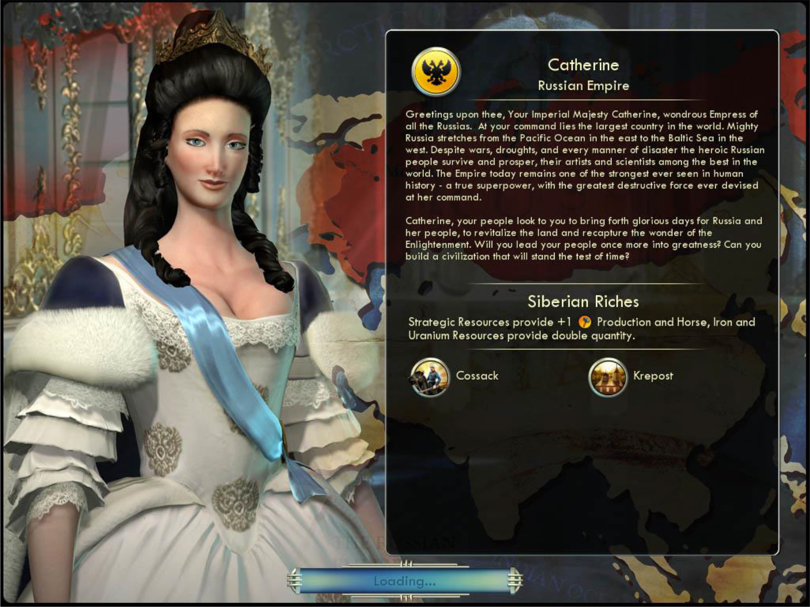 Внешний облик русской императрицы не соответствует привычному ее изображению на большинстве известных портретов. Если на картинах она представлена немолодой статной женщиной, то в игре она молода и излишне сексуализирована. С Екатериной легко подружиться, ее нельзя назвать разжигателем конфликтов. Но если игрок начнет с ней войну, то заключить мир будет очень сложно. Не стоит атаковать, если вы не уверены в победе. Мир она примет только, если вы дадите ей взамен города, ресурсы или большое количество золота. Она усиленно развивает науку и расширяет границы империи. Внешний вид Петра I больше похож на свой прототип по сравнению с Екатериной. Его черты несколько гипертрофированы, но образ узнаваем. Под руководством Петра I Россия показана быстро развивающейся страной, которая стремительно раздвигает свои границы. Игровой Пётр I, как и реальный, делает акцент на технологии и культуру и предпочитает деловые отношения со странами, не отстающими в развитии от России.