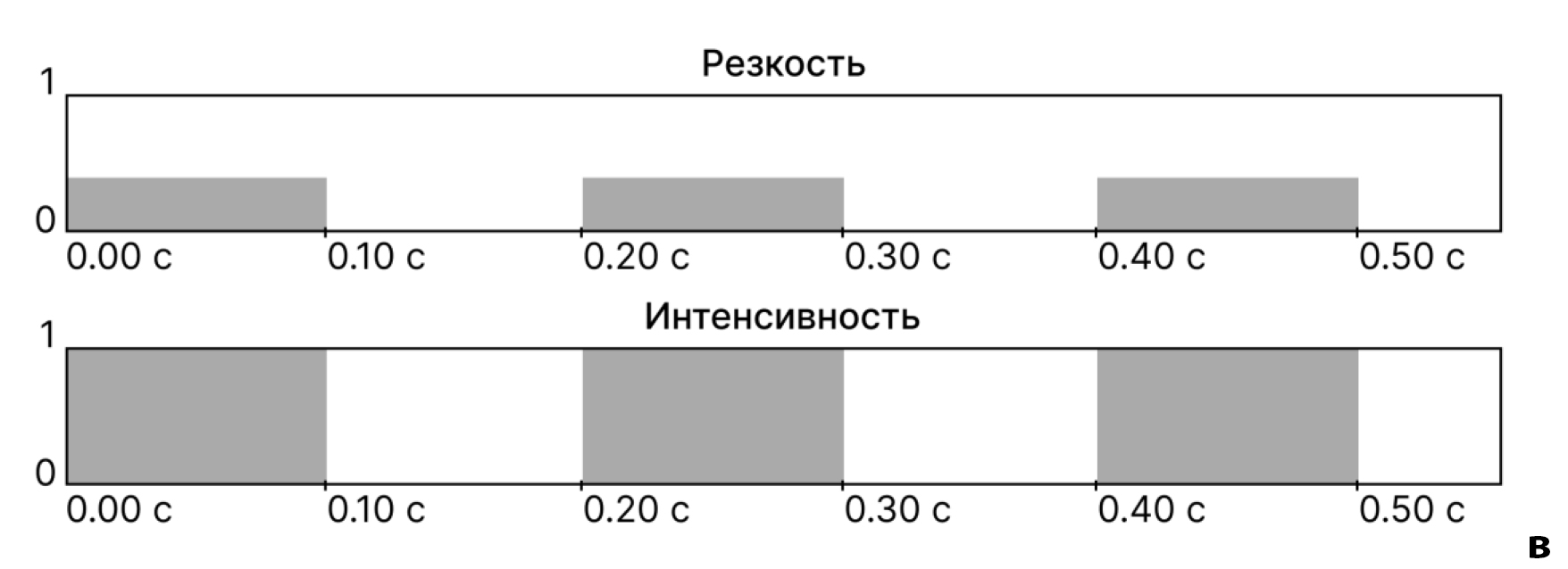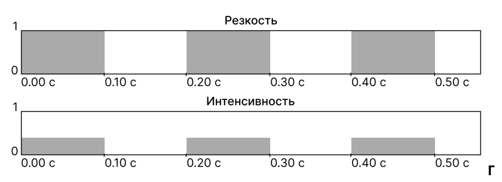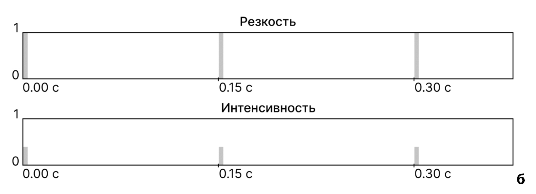 Вибрационный шаблон представляет из себя последовательность сигналов с определенными значениями параметров. Основные из них — резкость и интенсивность, каждая из которых может принимать значение от 0 до 1, а также продолжительность сигнала в секундах, которая может быть установлена только для непрерывного сигнала. Соответствующее значение резкости помогает передать пользователю ощущение мягкости, округлости и органичности или же четкости, точности и механичности. Интенсивность позволяет управлять силой тактильного сигнала. Визуализация этих параметров приведена на рисунке 3.
