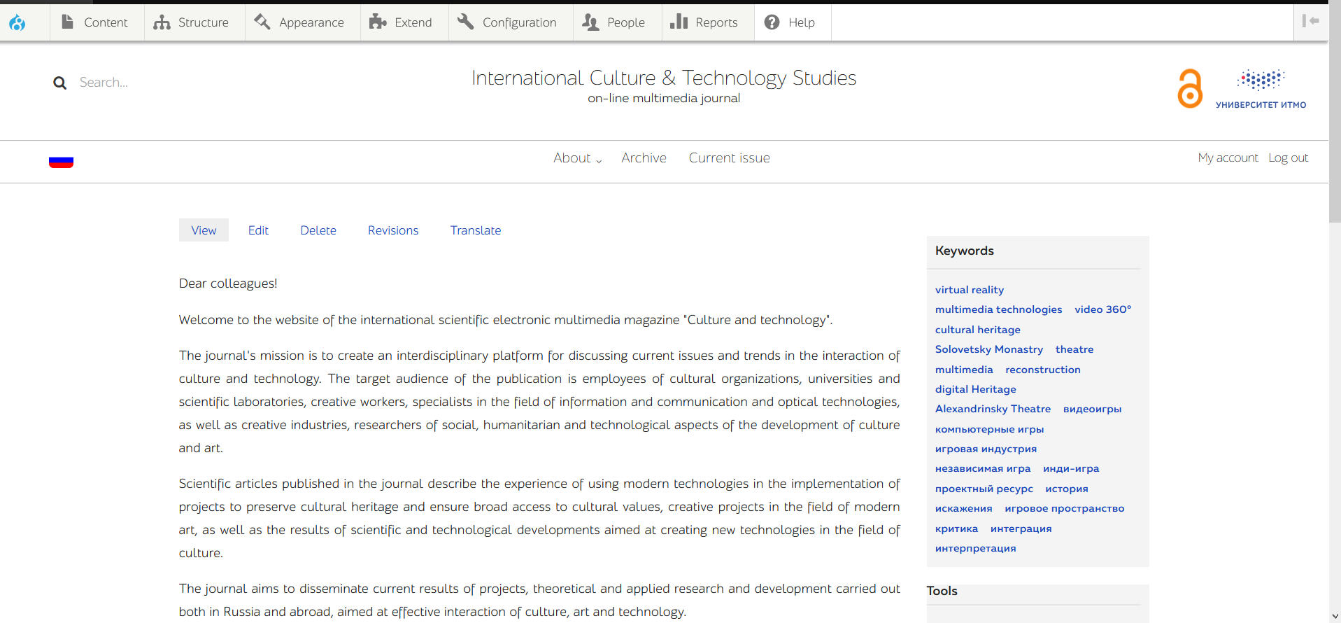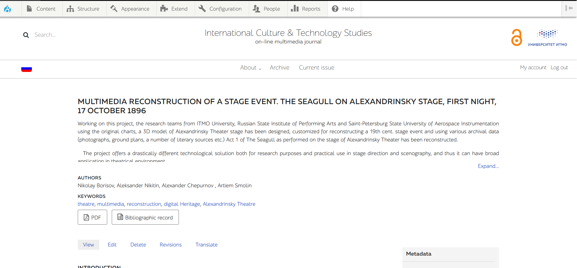 В течение 2020 года онлайн журнал «Культура и технологии» (http://cat.itmo.ru) был перенесен на разработанную версию платформы. Для сайта журнала был спроектирован и реализован интерфейс читателя, позволяющий просматривать мультимедийную статью в браузере. Статья и метаданные к ней находятся на одной странице и расположены в разных зонах и блоках. В начале страницы выводится аннотация, список авторов и ключевые слова. Доступ к PDF-версии и библиографическому описанию компактно реализован в виде кнопок. Библиографическое описание открывается во всплывающем окне. Метаданные вынесены в отдельный блок справа. Список литературы находится в подвале статьи.