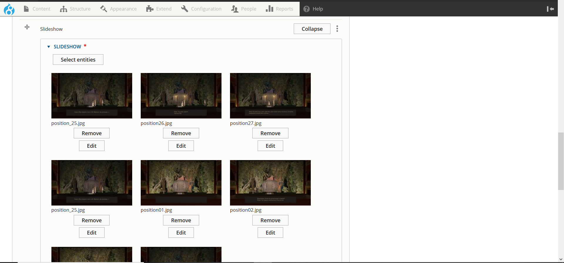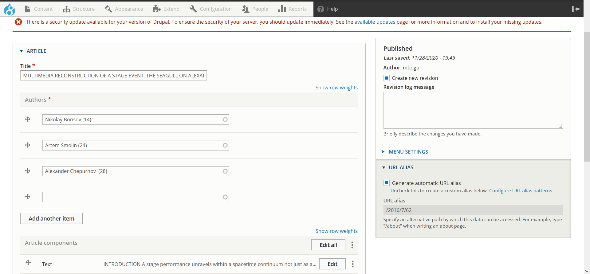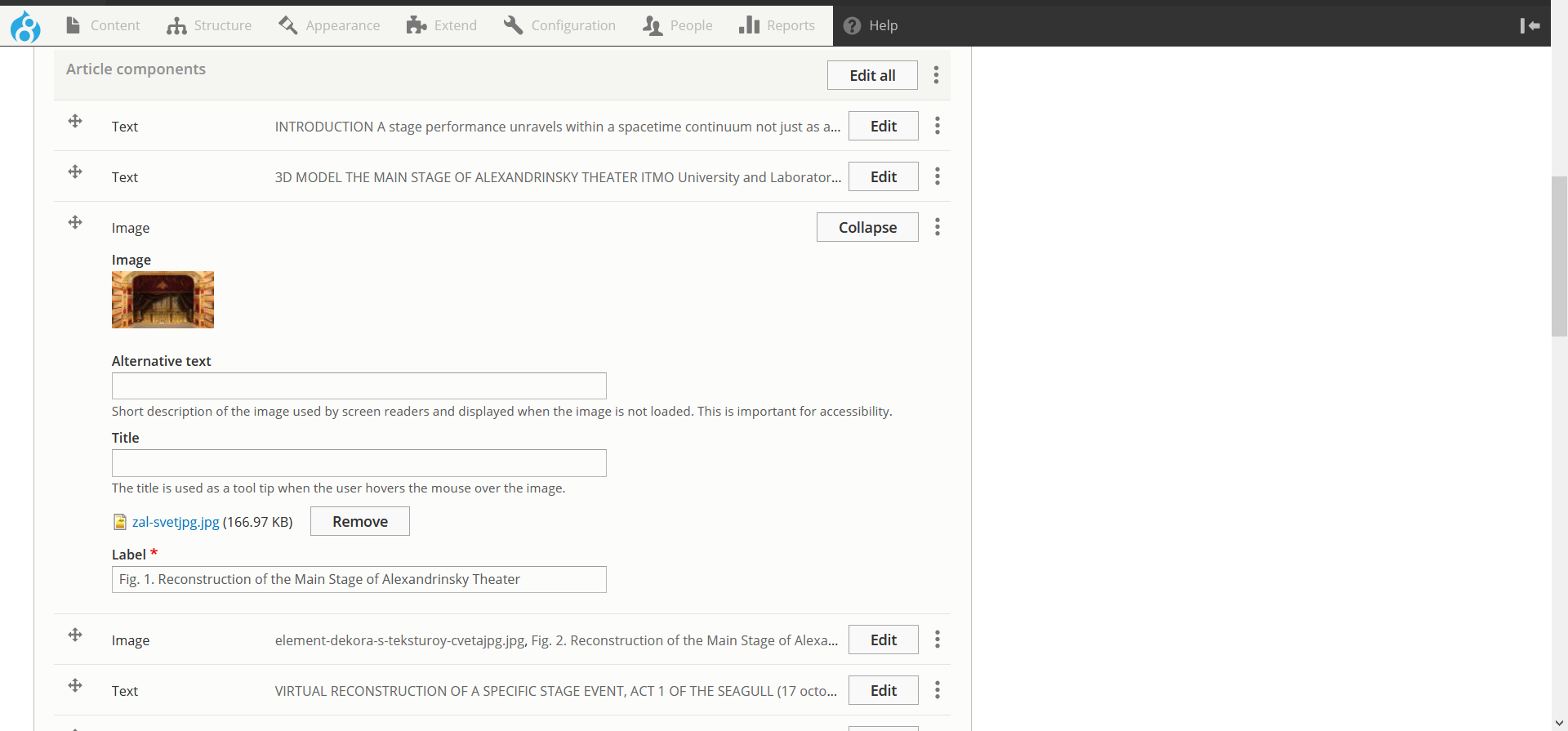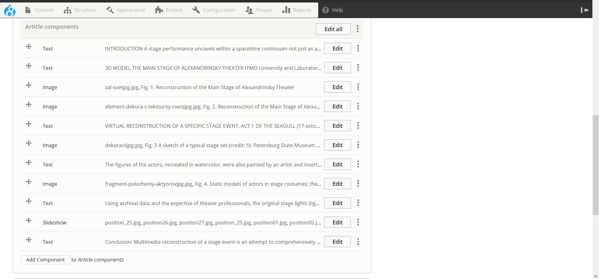 Реализация компонентного подхода базируется на применении модуля Drupal Paragraphs. На первом этапе разработки были созданы наиболее востребованные компоненты, позволяющие включать в статью текстовые фрагменты, галереи изображений различной функциональности, видео и звук. Ряд опубликованных статей использует эти возможности. В этой статье нам бы также хотелось воспользоваться мультимедийными возможностями платформы и продемонстрировать инструменты редактирования статьи в виде слайдера (рис. 2 — Слайдер 1).
