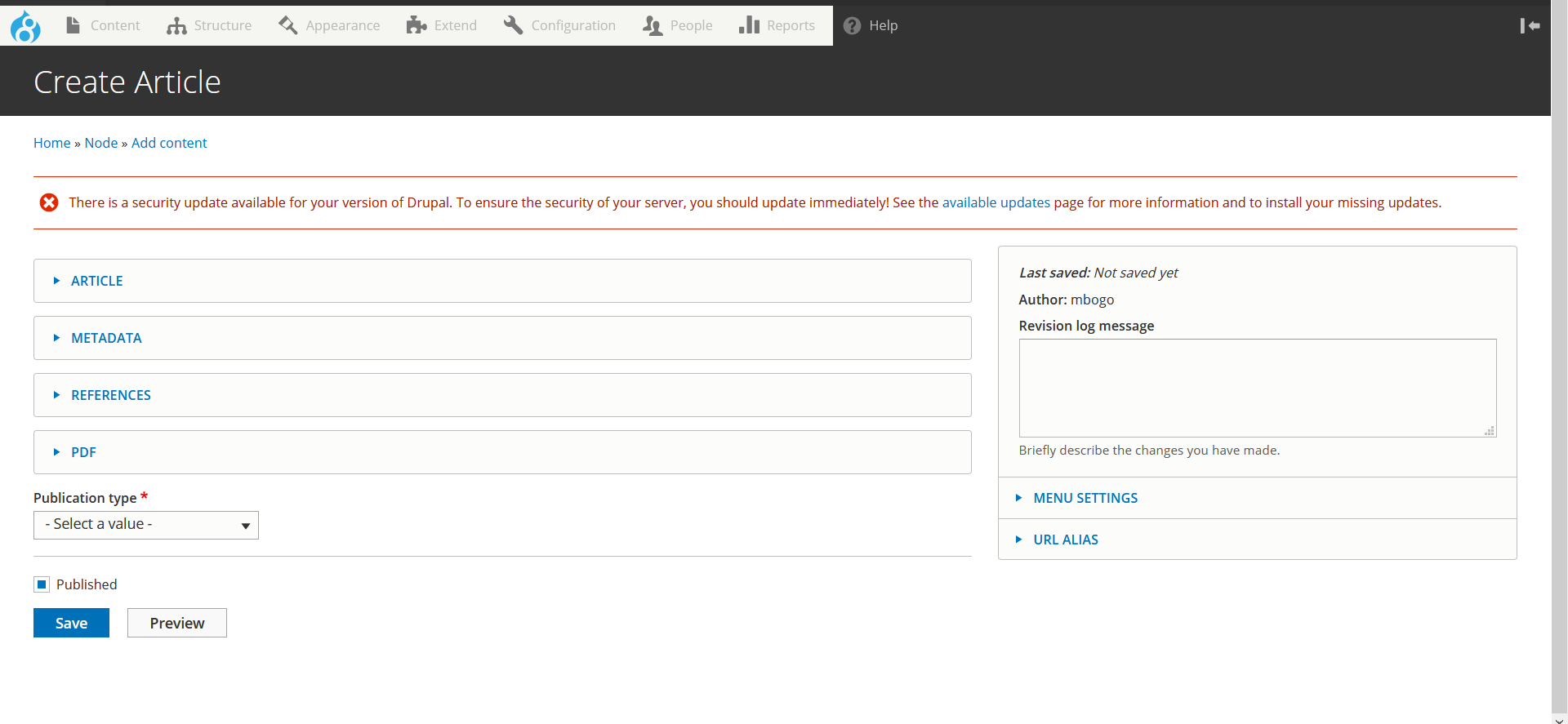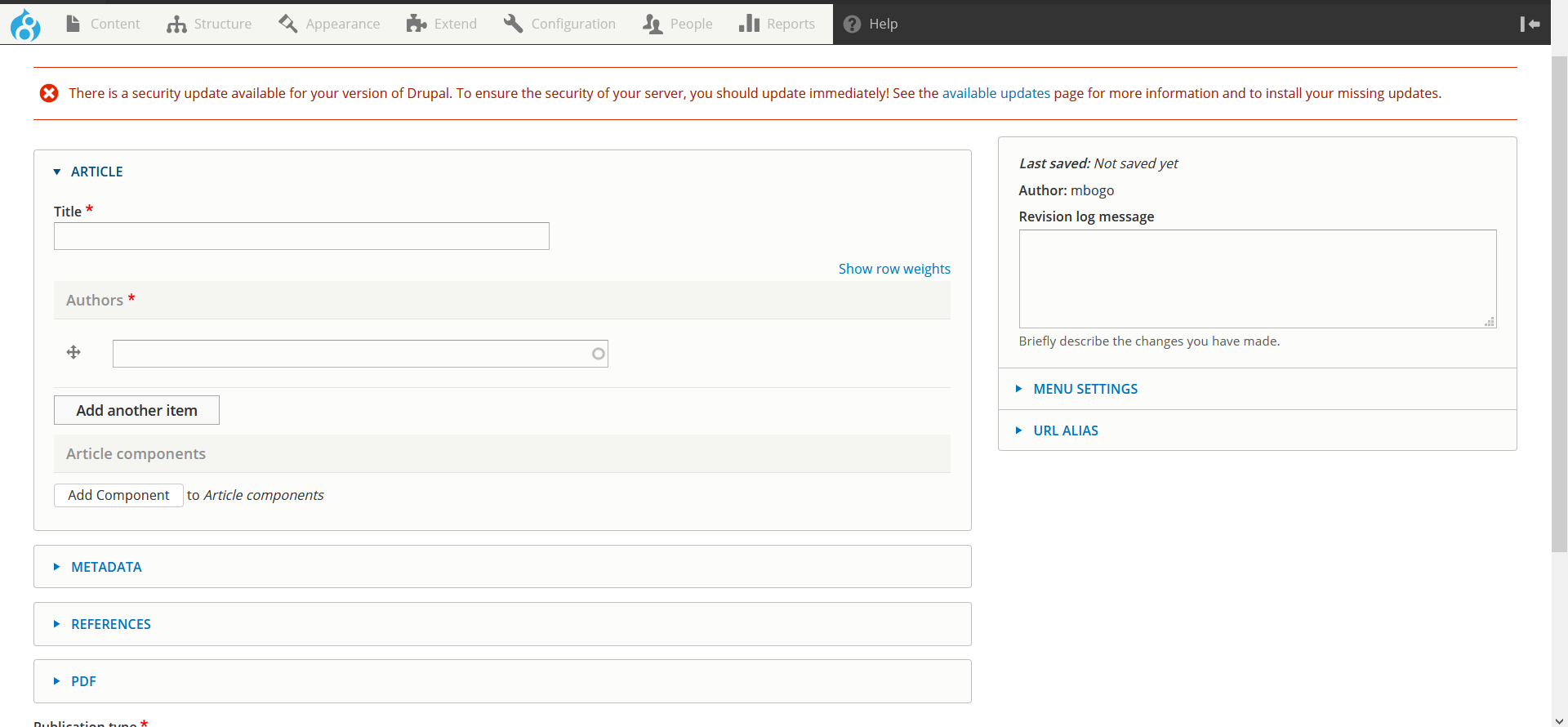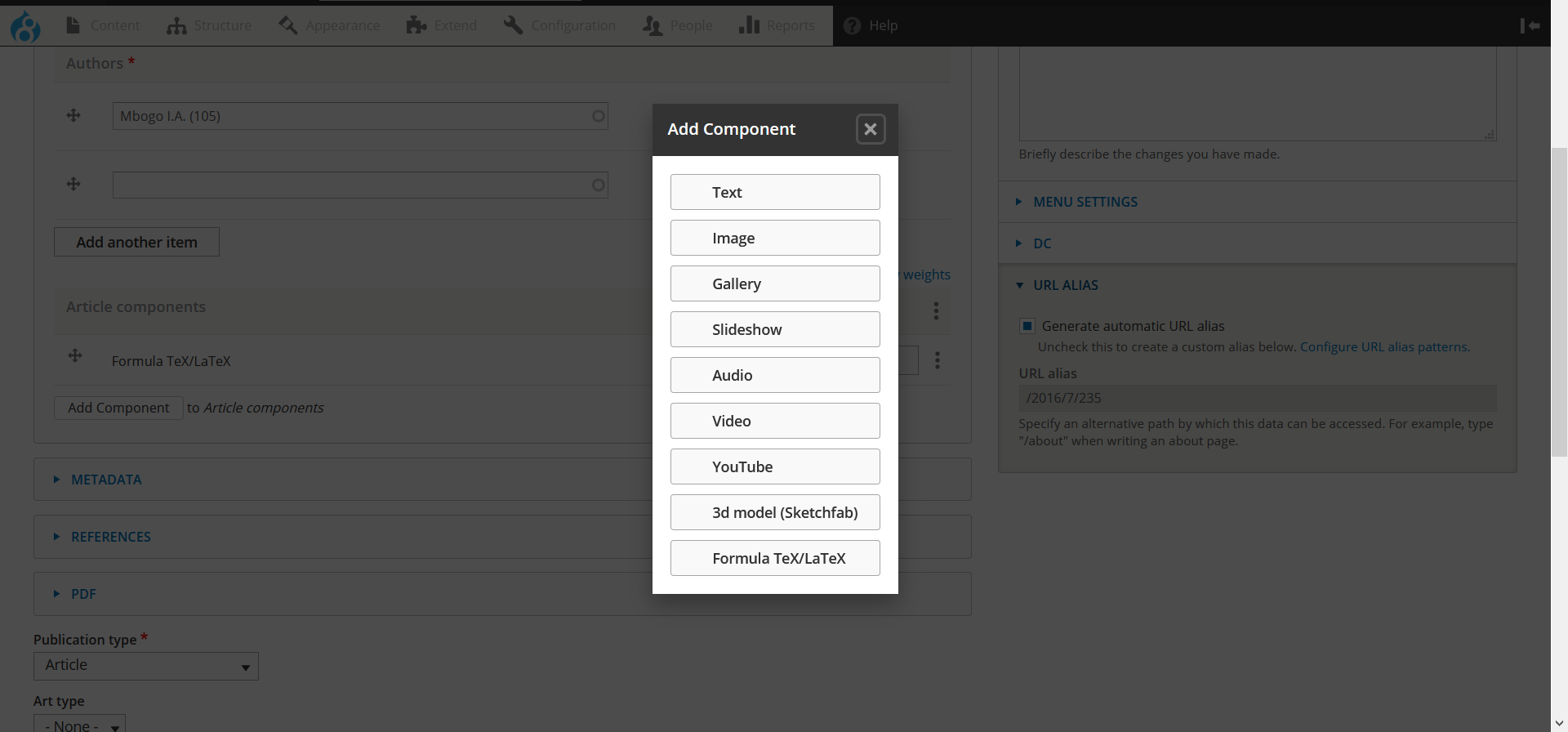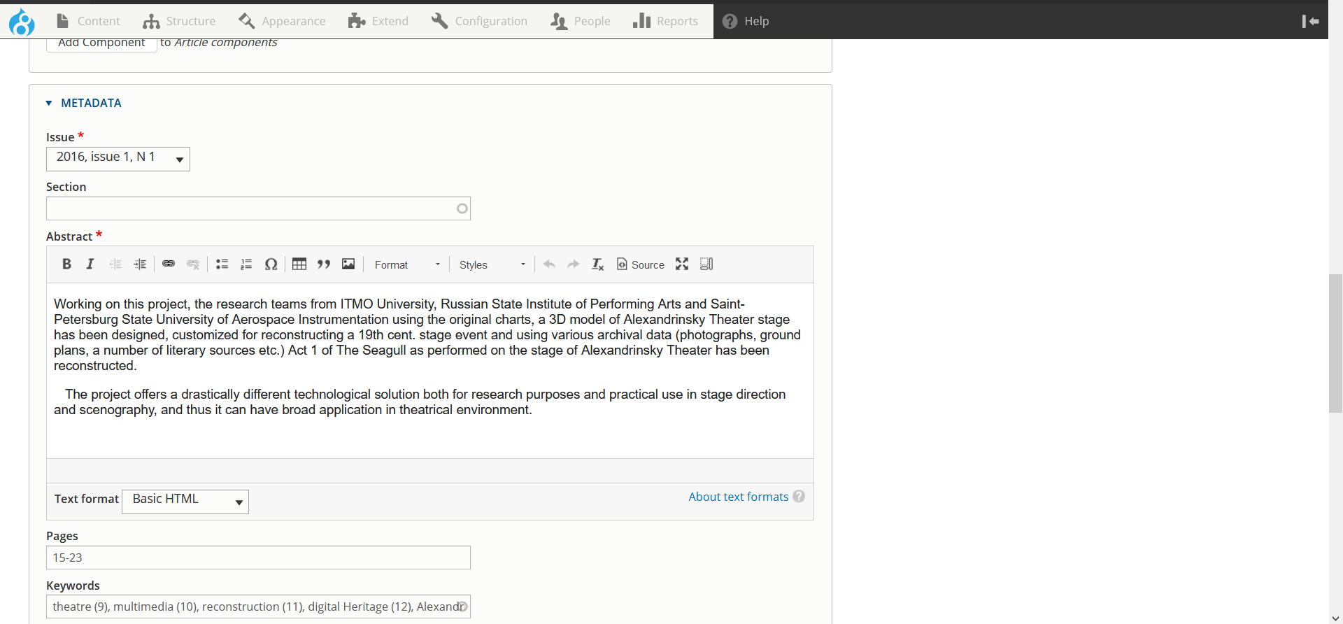 В первую очередь были реализованы основные поля метаданных, соответствующих Дублинскому ядру [5], а также дополнительные поля, используемые РИНЦ и DOAJ, такие как DOI, ISSN, ISBN, ORGID и другие. Кроме того, существуют метаданные, которые присущи уровню журнала, например, информация об издателе. Модули требуемой функциональности отсутствуют среди расширений Drupal, поэтому в ходе проекта программно реализуются инструменты экспорта в XML.