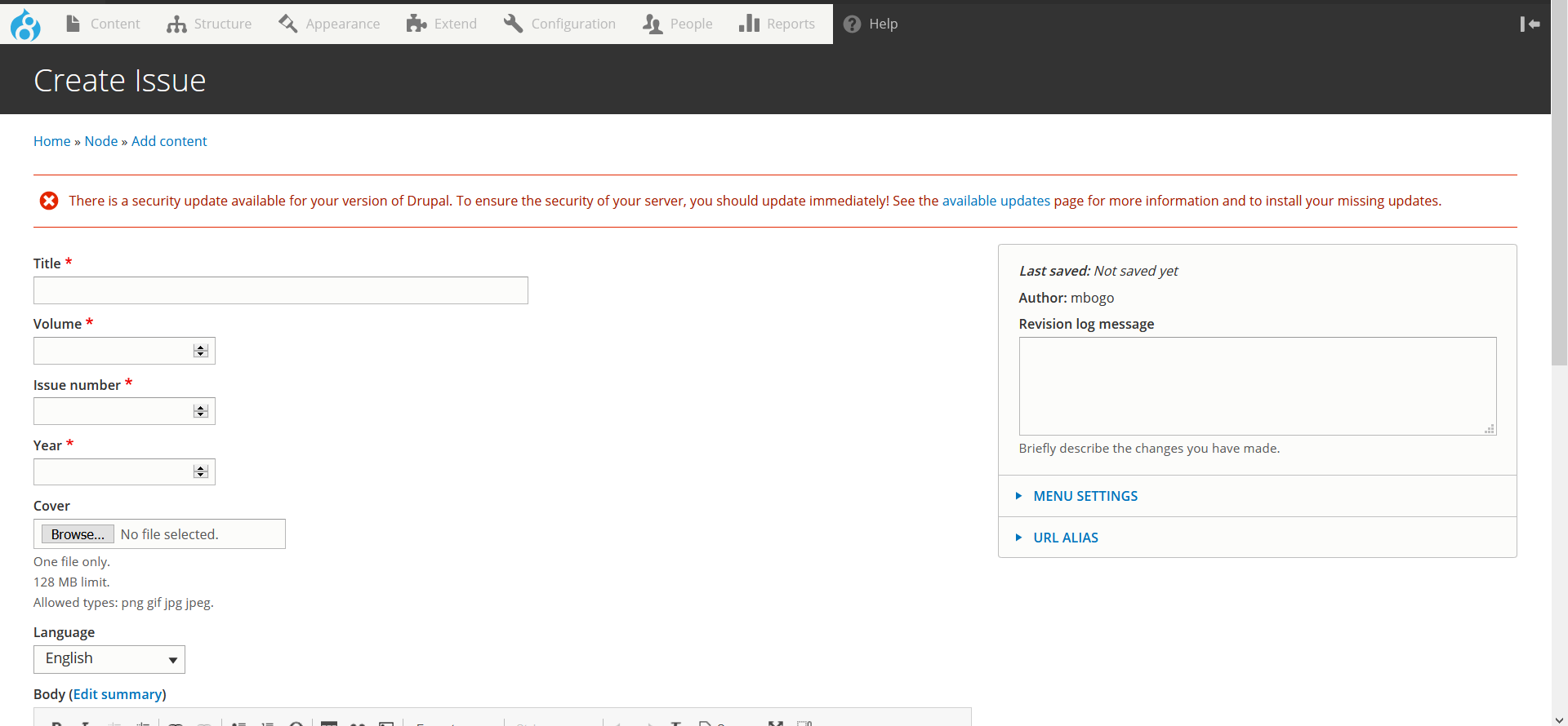 В основу системы были положены два связанных типа материалов — выпуск и статья. Выходные данные для выпуска журнала хорошо известны, поэтому тип материала «Выпуск» имеет необходимый набор полей, в которые значения вводятся через форму.