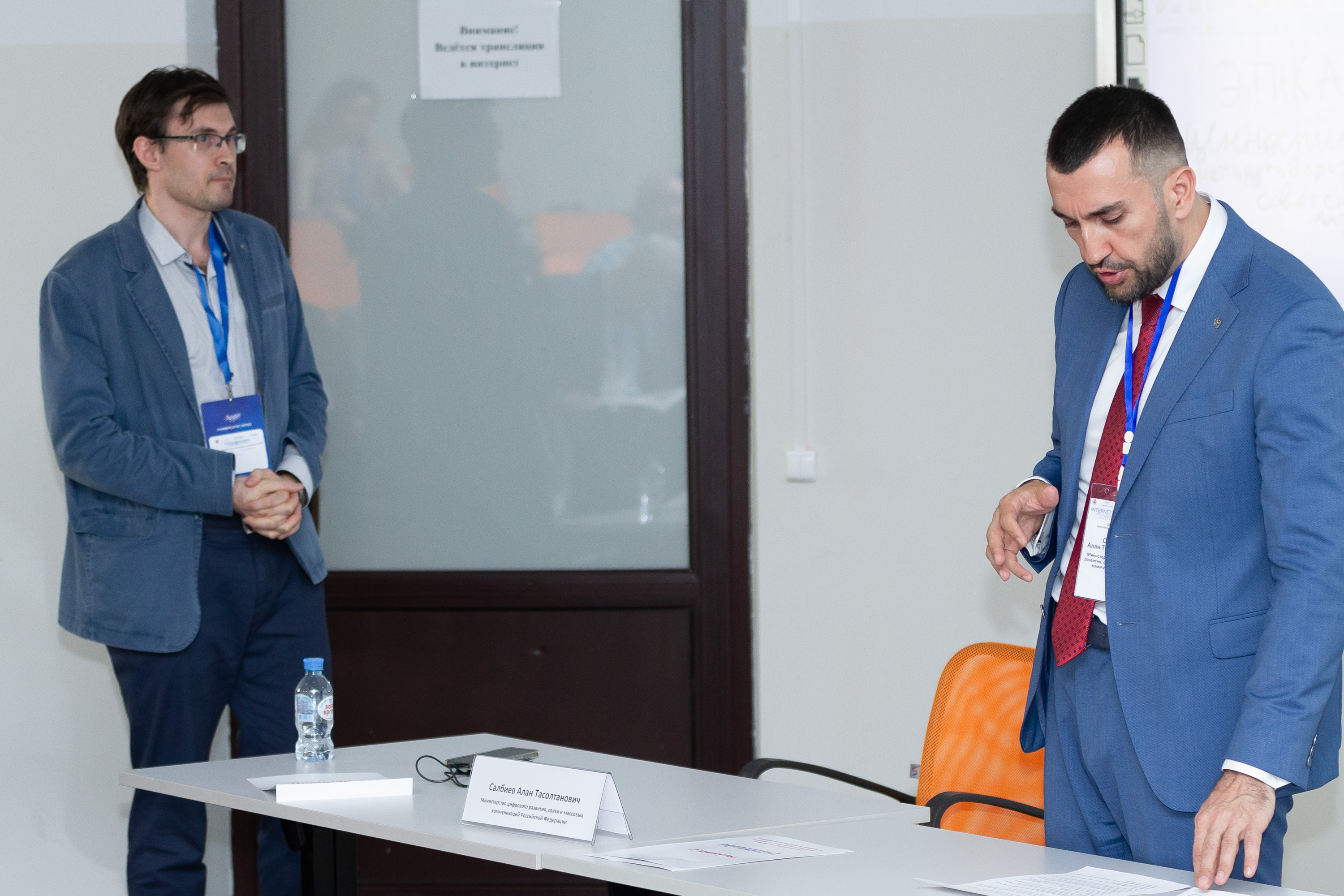 Круглый стол «Этико-правовые аспекты цифровой трансформации» (рис. 4) прошел с модерацией Алана Салбиева, канд. технич. наук, советника Министра цифрового развития, связи и массовых коммуникаций РФ, участника Coalition for Digital Environmental Sustainability (CODES) Программы развития ООН, секретаря рабочей группы по этике цифровой трансформации РФ Совета по развитию цифровой экономики при Совете Федерации ФС РФ. Участники в творческом и живом диалоге обсудили различные сценарии и возможные риски развития цифровых технологий, а также задачи и проблемы формирования методологических критериев этической и правовой экспертизы разработки и внедрения цифровых технологий на различных этапах их жизненного цикла.
